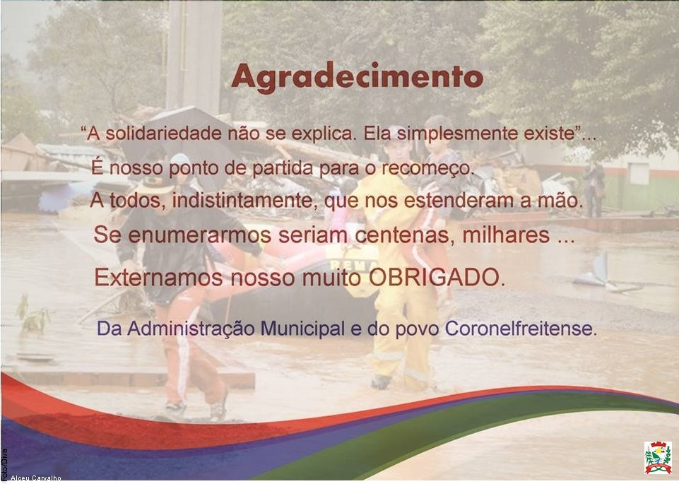 Coronel Freitas agradece voluntários que trabalharam no apoio às vítimas da enchente. Alceu Antonio Carvalho Jornalista Profissional MTB 0005533/SC Assessoria de Impresa Fone: (49) 3347 3400